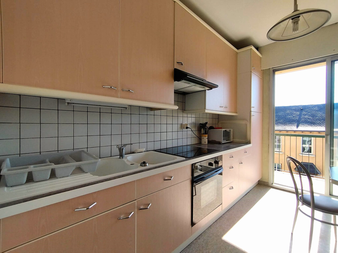 La cuisine séparée dispose également de son accès direct au balcon. Il est possible de supprimer la cloison entre la cuisine et le séjour afin de créer un bel espace de vie convivial.