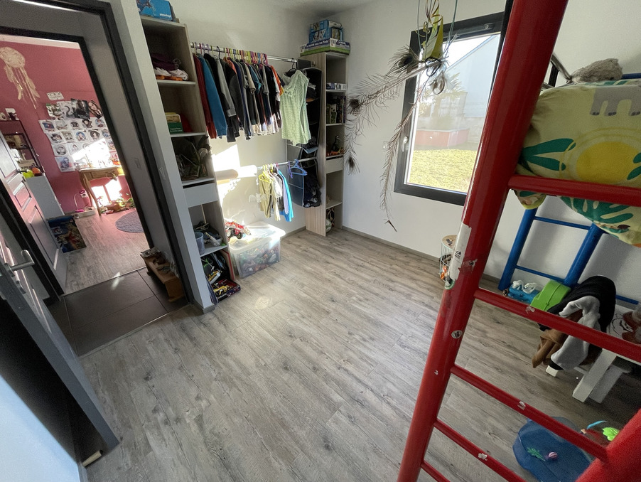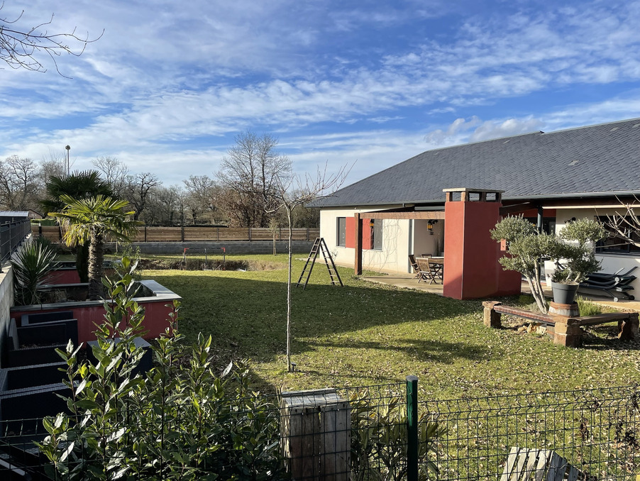 Maison de plain-pied, construite en 2017, sur un terrain arboré et clos de 950m2, elle se compose :